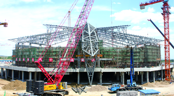 濱海體育中心建設(shè)是錦州全市人民的矚目工程,是向省政府承諾承辦2013年第十二屆全國(guó)體育運(yùn)動(dòng)會(huì)羽毛球比賽的重點(diǎn)工程。工程結(jié)構(gòu)形式較為特殊,鋼結(jié)構(gòu)總量4800多噸,施工過(guò)程中存在多個(gè)專(zhuān)業(yè)的交叉施工,受到場(chǎng)地條件、垂直運(yùn)輸?shù)闹萍s,對(duì)整個(gè)工程的安全管理要求很高。工程有幾個(gè)特點(diǎn),一是體量比較大,體育場(chǎng)建筑面積有62300平方米,二是工程復(fù)雜,屋面的網(wǎng)架大跨度253米,拱高75米,在我國(guó)也是個(gè)比較大的體育場(chǎng)工程,另外拱腳比較大,每個(gè)拱腳的土方量在1萬(wàn)立方米。